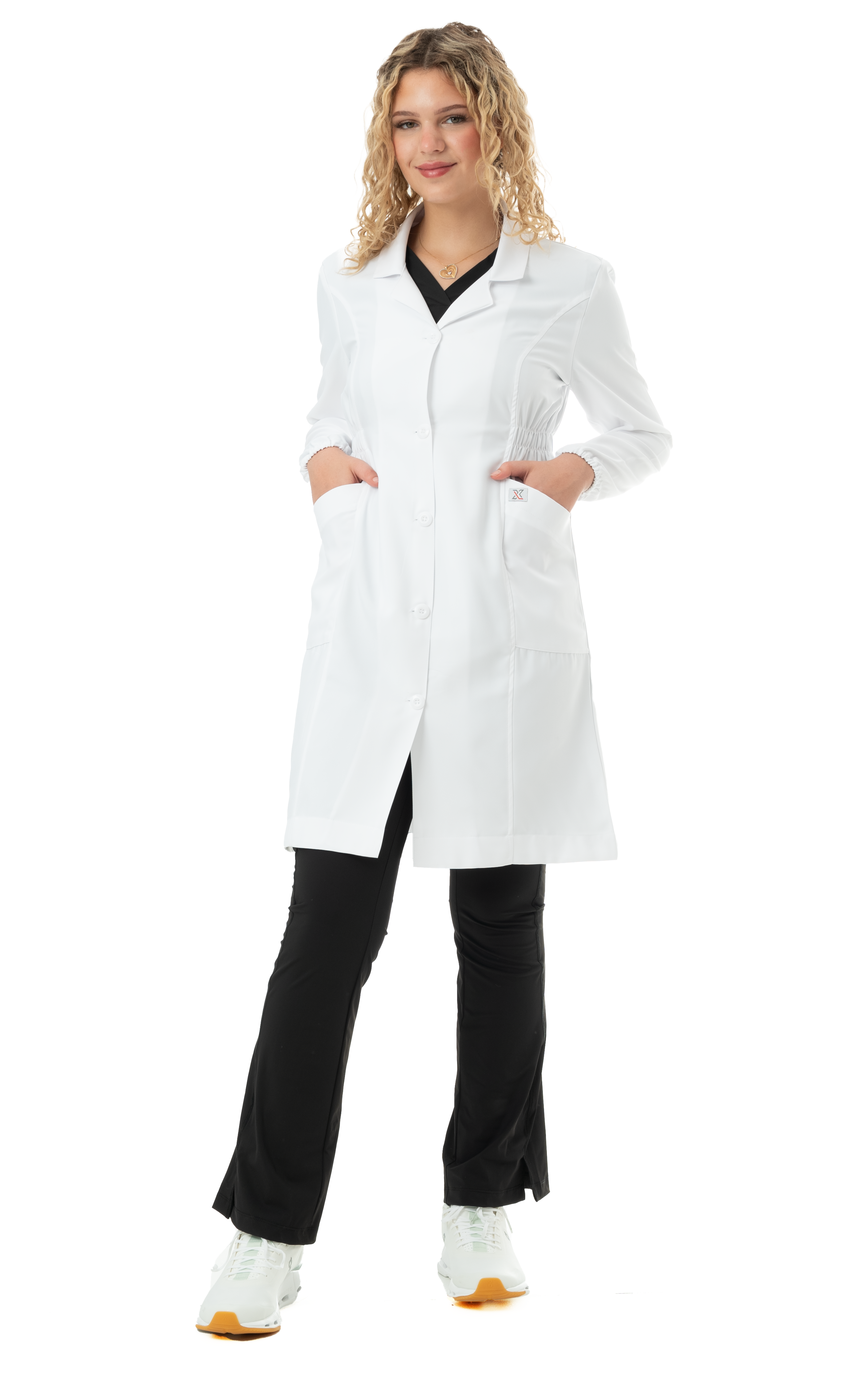 لابكوت طبي نسائي لون أوف وايت طول ( 37 إنش ) LX-0150012 | لوكاس آند أكس صُمم ليمنحك مظهراً مهنياً هادئاً يجمع بين الراحة اليومية والبساطة الراقية في بيئة العمل الطبية. لون الأوف وايت يضيف لمسة ناعمة ومنظمة على الإطلالة، بينما يمنح الطول 37 إنش توازناً مريحاً يساعد على الحركة ويحافظ على حضور مرتب طوال ساعات الدوام.