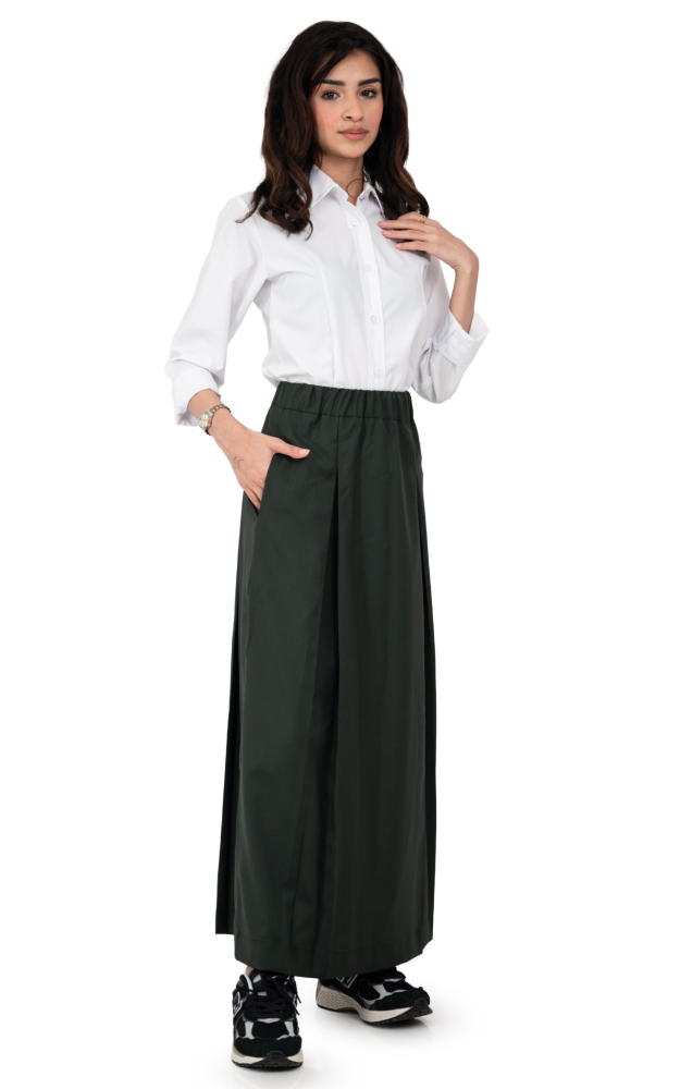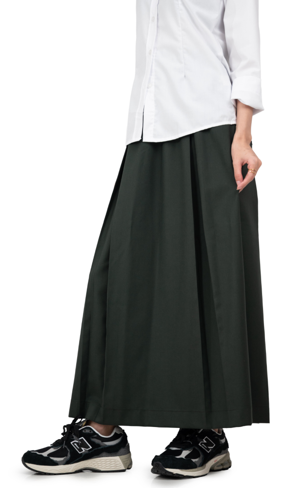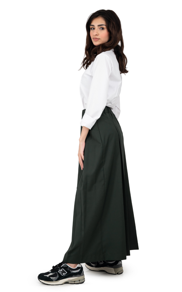 تنورة أنيقة بخصر مطاطي مريح يسهل اللبس، مزودة بجيب مخفي على الجهة اليمنى لمزيد من العملية، وسحاب جانبي مخفي على اليسار لإطلالة مرتبة. تتميز بتفاصيل كسرتين أمامية وكسرتين خلفية تضيف لمسة انسيابية وحركة جميلة. مصنوعة من خامة عالية الجودة بنسبة 80٪ بوليستر و 20٪ رايون تجمع بين المتانة والنعومة.