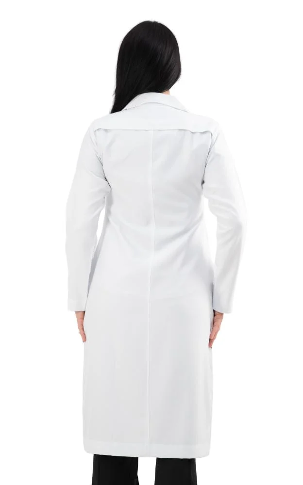 A modern tailored silhouette featuring flexible wrinkle resistant fabric, practical pockets, and front buttons suitable for everyday clinical duties.